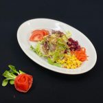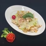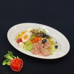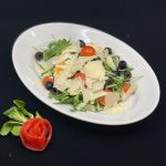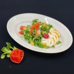 mit Champignons, Würstel, Ei, Erbsen und Oliven