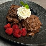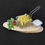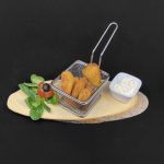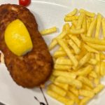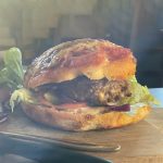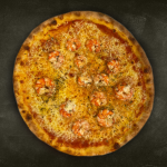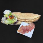 Pizzabrot mit Rindfleisch (150g) und Käse. Mit Mozzarella und Prosciutto überbacken. Serviert mit Salat, Tomaten, Zwiebeln, Essiggurken und Cocktailsauce